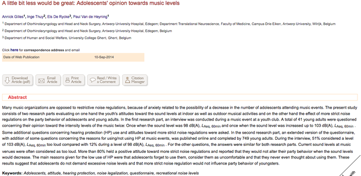 Un petit peu moins fort serait fantastique: l'opinion des adolescents sur le niveau sonore de la musique. Résultats d'une étude menée en Belgique, en deux phases : entretiens avec 41 adolescents sur leur opinion face à une musique à un niveau de 98 dBA, puis à un niveau de 103 dBA, et sur leurs comportements concernant le port de protections individuelles. Ensuite, le questionnaire a été diffusé sur internet et a recueilli 749 réponses: 51% considèrent que le niveau de 103 dBA est trop élevé et 12% que celui de 98 dBA est aussi trop élevé. Pour les protecteurs individuels les jeunes n'en portent pas principalement parce qu'ils oublient ou qu'ils les trouvent inconfortables. -