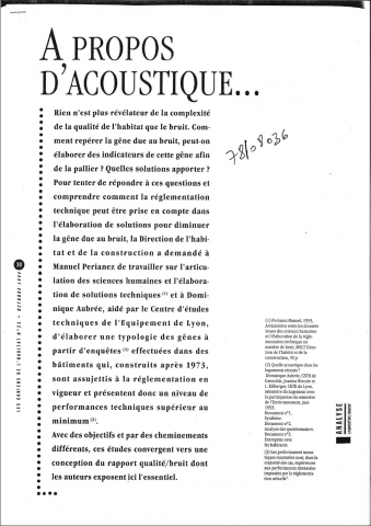 Pour tenter de répondre aux questions posées sur la gêne due au bruit, et de comprendre comment la réglementation technique peut être prise en compte dans l'élaboration de solutions pour diminuer cette gêne, la Direction de l'Habitat et de la Construction a demandé aux auteurs de cet article d'étudier ce problème. Avec des objectifs et par des cheminements différents, ces études convergent vers une conception du rapport qualité/bruit dont les auteurs exposent ici l'essentiel. -