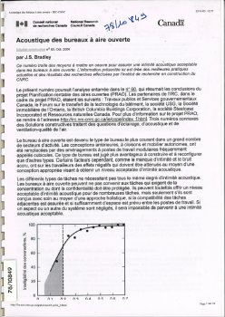 Présentation des moyens à mettre en oeuvre pour assurer une intimité acoustique acceptable dans les bureaux à aire ouverte. L'information présentée ici est tirée des meilleures pratiques actuelles et des résultats des recherches effectuées par l'institut de recherche en construction du Conseil National de Recherches Canada. -