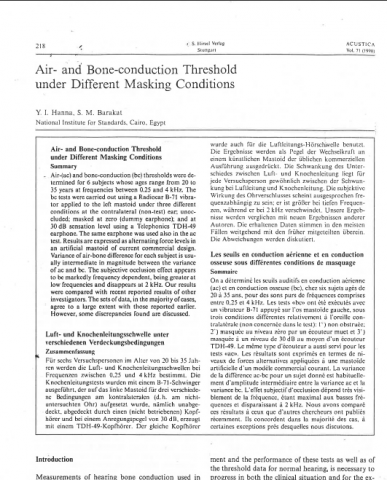 Les seuils d'audition en conduction aérienne et en conduction osseuse sous différentes conditions de masquage. Etude faite sur 6 sujets de 20 à 35 ans pour lesquels on détermine les seuils auditifs en conductions aérienne et osseuse pour des sons purs de fréquences comprises entre 0,25 et 4 kHz. Comparaison des résultats obtenus avec ceux d'autres chercheurs. -