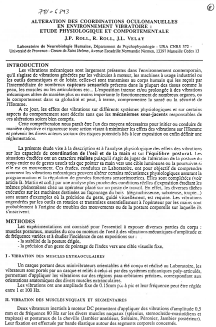 Description et analyse physiologique des effets des vibrations sur les capacités de coordination de l'œil et de la main et sur l'équilibre postural. L'objectif est de comprendre comment les vibrations mécaniques peuvent altérer certains mécanismes physiologiques assurant la programmation et la régulation de grandes fonctions sensorimotrices. (Pour la partie 2, voir CIDB 78/06892) -
