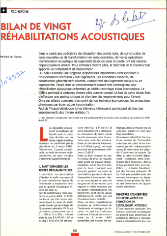 De vastes opérations d'amélioration acoustique de logements ont été menées dans le cadre des opérations de résorption des points noirs, de constructions de voies nouvelles ou de transformation de voies existantes. Pour cela, le CSTB a examiné une vingtaine d'opérations importantes correspondant à l'insonorisation de 2 000 logements. -
