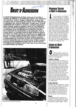 Le bruit d'admission de sloteurs (pièces) est audible aussi bien à l'extérieur du véhicule qu'à l'intérieur. Les deux causes principales sont analysées : bruit de bouche et bruit rayonné. Présentation du programme informatique Sappy, qui permet de calculer les admissions de n'importe quelle géométrie, et des différentes solutions pour installer une admission silencieuse sur un moteur essence : résonateur de Helmholtz, résonateur quart d'onde, silencieux. -