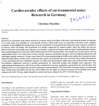 Les effets cardiovasculaire du bruit dans l'environnement : les recherches en Allemagne. Les recherches ont débuté dans les années 50 et le bruit a été alors considéré comme agent stressant non spécifique. Depuis les années 60, les effets d'une exposition à long terme au bruit routier ont été étudiés grâce à l'épidémiologie, puis on s'est intéressé à l'exposition au bruit des avions dans les années 70. Plus de 20 recherches sur le bruit routier montrent des effets cardiovasculaires, particulièrement en ce qui concerne le bruit nocturne. Des recherches complémentaires sont encore nécessaires, notamment sur la multiexposition et les groupes vulnérables. L'agence fédérale de l'environnement recommande déjà des niveaux de 65 dBA le jour et 55 la nuit visant à long terme 55/4 -