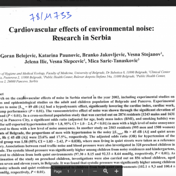 Les effets cardiovasculaires du bruit dans l'environnement. Recherches en Serbie. Les études ont débuté en Serbie en 2002. L'exposition à des niveaux Leq de 89 dBA a montré des effets sur le rythme cardiaque et les performances de pompage du coeur. Des études menées à Belgrade sur 856 écoliers entre 7 et 11 ans ont montré une élévation de la pression systolique chez les enfants travaillant dans des écoles bruyantes et résidant en quartiers calmes par rapport à ceux fréquentant une école moins exposée. -