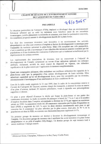 Charte élaborée par des représentants de toutes les parties intéressées au sein du comité de rédaction constitué par la commission consultative de l'environnement (CCE) de l'aéroport de Paris-Orly. Elle a pour ambition de contribuer à l'optimisation environnementale, économique et sociale de la plate-forme aéroportuaire. Elle décrit les lignes d'actions à entreprendre des différents signataires pour que les nuisances sonores soient non seulement maîtrisées mais qu'elles puissent décroître aussi rapidement. Elle comporte en annexe un plan général de l'aéroport d'Orly illustrant divers éléments évoqués. -