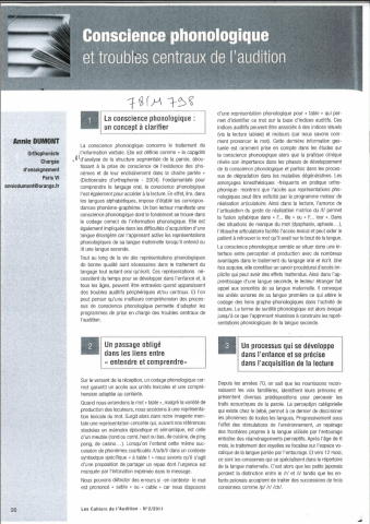 Présentation de la conscience phonologique qui concerne le traitement de l'information verbale : liens entre entendre et comprendre ; un processus qui se développe dans l'enfance et se précise dans l'acquisition de la lecture ; conscience phonologique et fonctions cognitives ; conscience phonologique et co-modalités perceptives ; conscience phonologique et trouble spécifique du langage ; perspectives dans les troubles centraux de l'audition. -