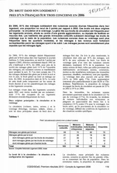 Résultat d'une enquête menée en 2006 sur le bruit ressenti dans son logement. 30% des ménages subissaient des nuisances sonores diurnes fréquentes dans leurs logement, une proportion en recul de 3 points par rapport à 2002. Ces bruits ont deux origines principales : la circulation et le voisinage. La gêne liée aux bruits de circulation est fréquente pour les logements anciens, situés au centre d'une grande agglomération, ou équipés de fenêtres en mauvais état. Les habitants des grands immeubles collectifs et quartiers modestes subissent davantage les bruits de voisinage que le reste de la population ainsi que les ménages à bas revenus. Les ménages jeunes sont plus exposés que les ménages âgés. -
