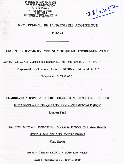 Compte-rendu de la mission confiée par l'ADEME relative à l'élaboration d'un cahier des Charges Acoustiques pour les Bâtiments à Haute Qualité Environnementale. La mission constitue une extension de l'étude réalisée par le GIAC pour le compte de l'ADEME en 1998-2000, et concerne donc les bâtiments à vocation d'enseignement musical, les locaux destinés à abriter les répétitions de Musiques Actuelles, et les salles polyvalentes communales et départementales. -