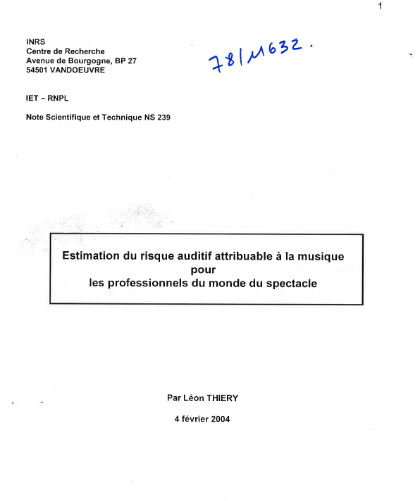 Estimation du risque auditif attribuable à la musique pour les professionnels du monde du spectacle - rapport