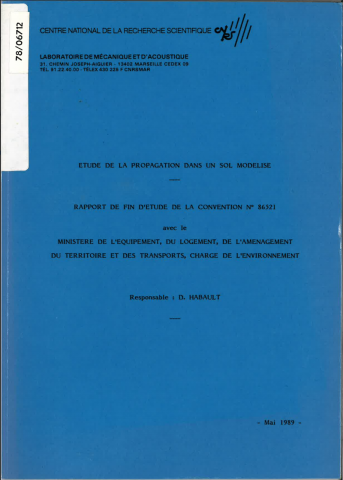 Propagation des vibrations dans le sol. L'étude a pour objectif d'évaluer le déplacement produit par une source vibratoire en tous points du sol, pour divers modèles de sols. Elle a permis également de tester l'efficacité de tranchées qui sont des moyens de protection contre la propagation d'ondes. Rappel des résultats élastiques et de viscoélasticité utilisés au cours de l'étude; calcul du déplacement dans une couche de matériau viscoélastique homogène; déplacement dans une couche viscoélastique avec obstacle; présentation de méthodes asymptotiques. -