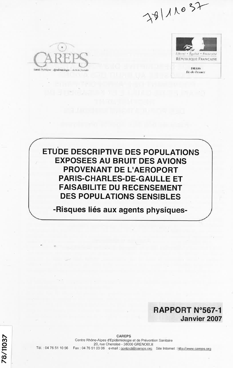 Etude descriptive des populations exposées au bruit des avions provenant de l’aéroport Paris-Charles-de-Gaulle et faisabilité du recensement des populations sensibles. Risques liés aux agents physiques
