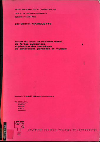 Analyse du bruit des moteurs diesel aux fréquences supérieures à 600 Hz, avec une largeur de bande de 140 Hz. Rappel des principales étapes de l'étude du bruit de moteurs diesel (l'étude bibliographique) qui ont conduit à choisir la méthode de calcul des cohérences partielles et multiples, dont la théorie est développée en détail. Etude détaillée du moteur MGO V12 sur la SACM. Présentation des résultats. -