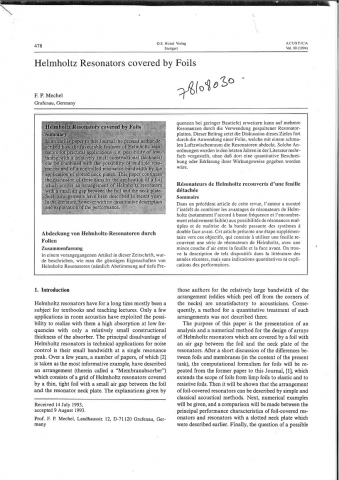 Résonateurs d'Helmholtz couverts par des feuilles. Il a déjà été montré l'intérêt de combiner les avantages de résonateurs de Helmholtz aux possibilités de résonances multiples et de maîtrise de la bande passante des systèmes à double face avant. Cet article présente une étape supplémentaire vers ces objectifs, qui consiste à utiliser une feuille recouvrant une série de résonateurs de Helmholtz, avec une mince couche d'air entre la feuille et la face avant. -