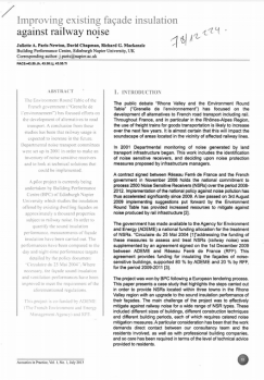 Améliorer l'isolation acoustique existante de façades vis-à-vis du bruit de train. Projet pilote mené par le centre de performances de la constructions (BPC) d'Edimbourg sur 1000 propriétés situées en Rhône-Alpers soumises au bruit de trafic ferroviaire. Projet cofinancé par RFF et ADEME. Les améliorations obtenues. Les difficultés rencontrées (artisans insuffisamment qualifiés, extractions d'air non efficaces...). -
