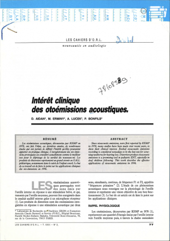 Les otoémissions acoustiques, découvertes par Kemp en 1978, ont fait l'objet, ces dernières années, de nombreuses études qui ont permis de définir l'intérêt qu'elles pouvaient apporter en pratique clinique. L'enregistrement des otoémissions provoquées est considéré actuellement comme le meilleur test pour le dépistage de la surdité du nouveau-né. Les produits de distorsion représentent un grand avenir en ORL pédiatrique, notamment dans le suivi de l'enfant sourd. Le but de ce travail est de faire le point sur les applications cliniques des otoémissions en 1996. -