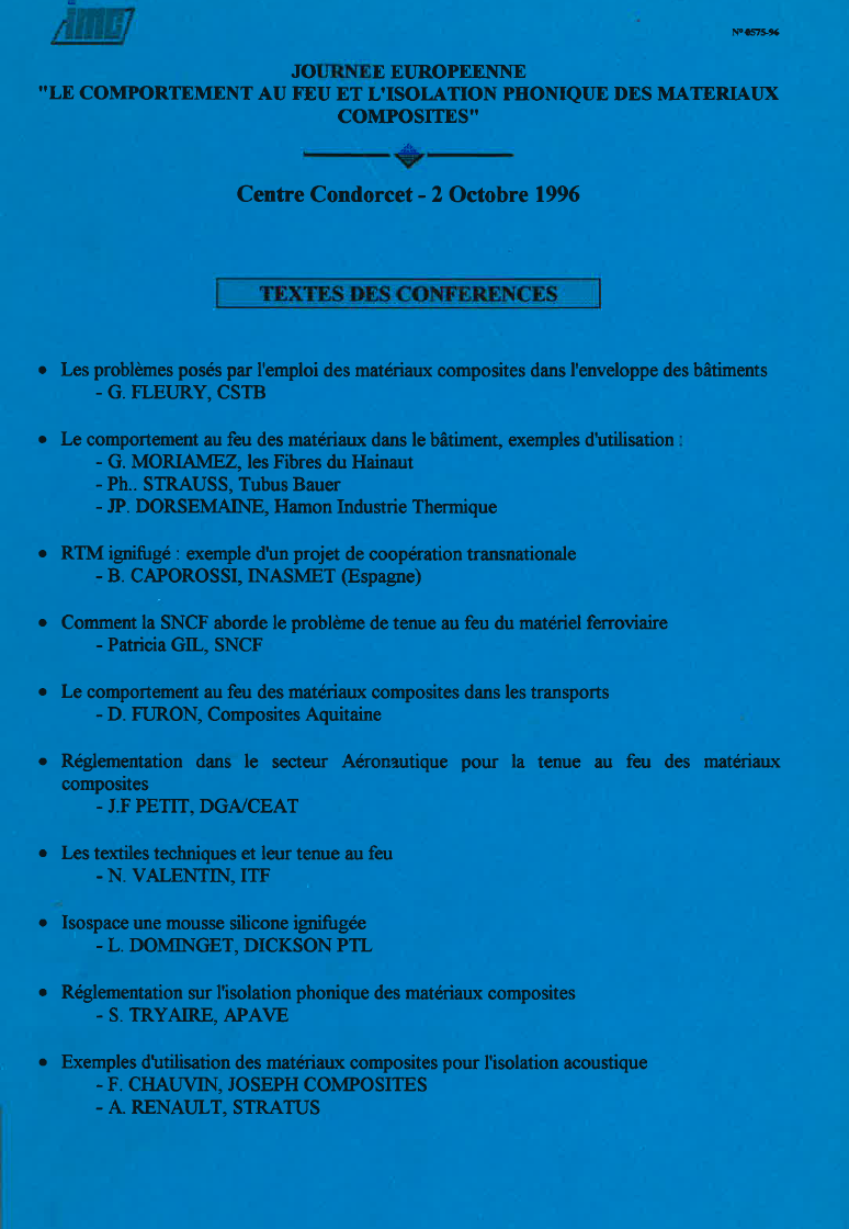 Journée européenne : le comportement au feu et l'isolation phonique des matériaux composites, Centre Condorcet, 2 Octobre 1996