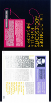 Les pertes auditives dues au bruit semblent de plus en plus importantes chez les adolescents. Celles-ci sont essentiellement liées aux habitudes récréatives dans cette tranche d'âge. Ainsi des propositions de mesures de prévention efficaces comme par exemple la limitation des niveaux sonores dans les concerts de musique ou en sortie des appareils MP3 ont été faites. Pour nous sensibiliser, l'auteur de cet article présente quelques données de psychoacoustique et de physiologie, la fragilité auditive des enfants et des adolescents ainsi que quelques recommandations. -