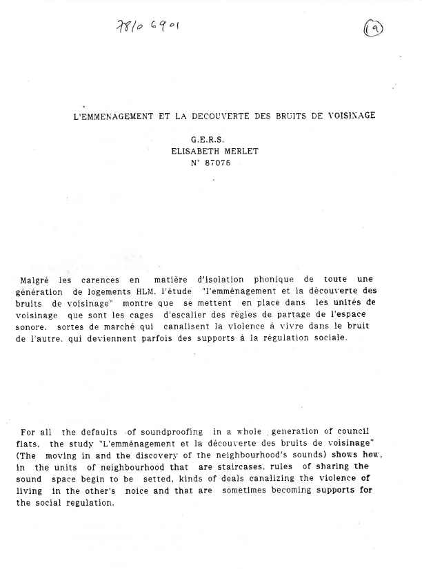 Cette étude montre que se mettent en place, dans les unités de voisinage que sont les cages d'escalier, des règles de partage de l'espace sonore, sortes de marchés qui canalisent la violence à vivre dans le bruit de l'autre, qui deviennent parfois des supports à la régulation sociale. Voir pour la deuxième partie n° 78/07289. -