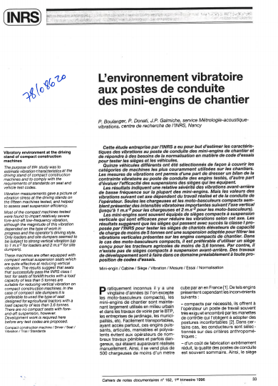 Cette étude entreprise par l'INRS a eu pour but d'estimer les caractéristiques des vibrations au poste de conduite des mini-engins de chantier et de répondre à des besoins de normalisation en matière de code d'essai pour tester les sièges et les véhicules. Les résultats (testés à travers quinze véhicules sélectionnés de façon à couvrir les catégories de machines les plus couramment utilisées sur les chantiers) ont mis en évidence une relative sévérité des vibrations avant-arrière de basse fréquence. -