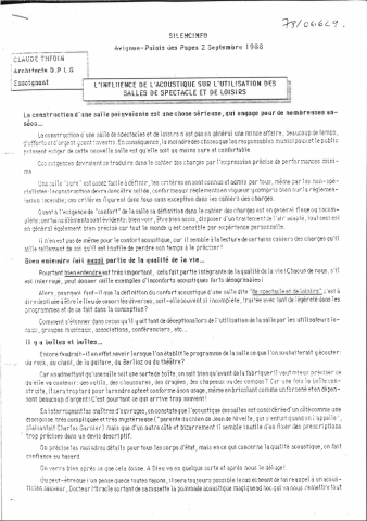 L'influence de l'acoustique sur l'utilisation des salles de spectacle et de loisirs. In: Silencinfo, Avignon, 2 septembre 1988