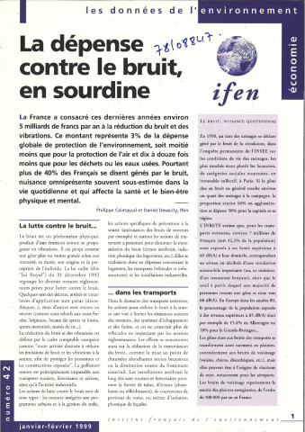 Présentation par l'IFEN de chiffres issus de l'évaluation de la dépense nationale de réduction du bruit et des vibrations réalisée selon la méthodologie SERIEE (système européen de rassemblement de l'information économique sur l'environnement). Le montant représente 3% de la dépense globale de protection de l'environnement, soit moitié moins que pour la protection de l'air et dix à douze fois moins que pour les déchets ou les eaux usées. Pourtant plus de 40% des Français se disent gênés. -