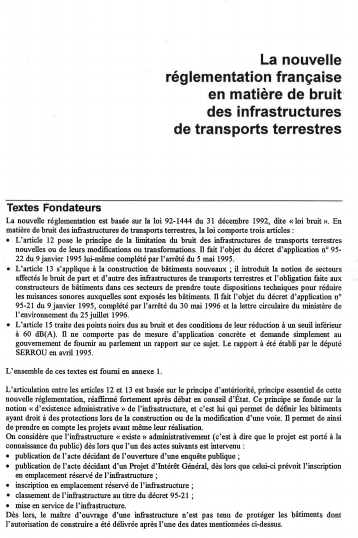 La nouvelle réglementation est basée sur la loi 92-1444 du 31 décembre 1992, dite loi bruit et s'articule autour de trois articles fondamentaux, faisant l'objet de trois analyses particulières : la limitation du bruit des infrastructures de transports terrestres (construction de voies nouvelles et modification de voies existantes): article 12 de la loi bruit, la construction de bâtiments à proximité d'infrastructures de transports terrestres bruyantes; article 13 de la loi bruit et le rattrapage des points noirs bruit; article 15 de la loi bruit. -