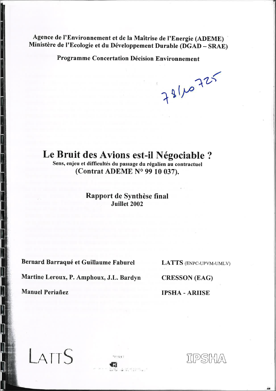 Après une enquête de gêne sonore, présentation des travaux de trois partenaires : un psycho-sociologue a ré-expertisé les entretiens en profondeur pour déplacer le bruit dans le vécu des individus des sites choisis pour le sondage, un jeune enseignant d'urbanisme a synthétisé de façon critique les études relatives à l'urbanisation au voisinage des aéroports, enfin, le CRESSON a comparé le conflit de Roissy CdG avec d'autres conflits d'environnement et d'autres gestions aéroportuaires en France et en Suisse. La recherche aboutit à proposer une refondation du débat d'avantage sur les enjeux territoriaux et socio-économiques, et moins sur des thèmes purement acoustiques (une approche qui accompagne une impasse de la politique). -
