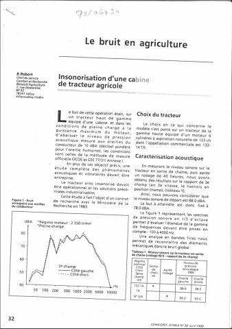 Isolation acoustique d'une cabine de tracteur de 10 dB (a), à la suite d'un contrat de recherche de Renault agriculture avec le Ministère de la Recherche. Parallèlement, l'étude devait porter sur les phénomènes acoustiques et vibratoires. Le modèle étudié était un haut de gamme, équipé d'un moteur 6 cylindres à aspiration naturelle de 123 ch dont l'appellation commerciale est 133-14 XT. -