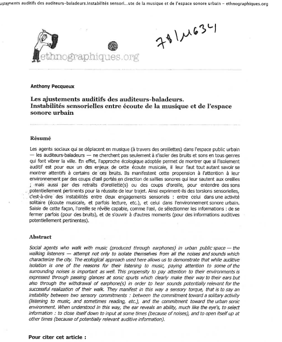 Étude menée par un sociologue qui a observé dans le métro une douzaine de voyageurs écoutant leur baladeur. Si l'isolement auditif est pour eux un des enjeux de cette écoute, ils se montrent néanmoins attentifs à certains bruits de la ville et sont capables de sélectionner des informations pertinentes. -