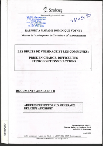 Les bruits de voisinage et les communes : Prise en charge, difficulté et propositions d'actions. Documents Annexe 2. Rapport à Madame Dominique Voynet