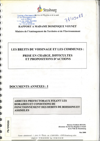 Les bruits de voisinage et les communes : Prise en charge, difficultés et propositions d'actions. Documents Annexe 1. Rapport à Madame Dominique Voynet