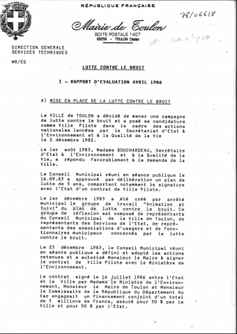 Toulon, ville pilote, a mis en oeuvre une campagne de lutte contre le bruit en 1983. Sensibilisation à cette campagne auprès de la population locale par affichage, édition d'un journal, enquête, animation, concours scolaire. -