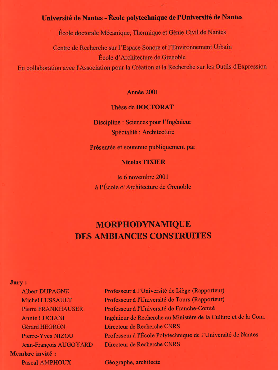 Présentation des travaux sur les ambiances architecturales et urbaines. Cette recherche se propose de tester des modèles morphodynamiques générant des représentations de phénomènes sensibles par synthèse numérique. Une confrontation entre l'observation in situ de ces phénomènes et les représentations sonores et visuelles issues de la synthèse est alors rendue possible. -