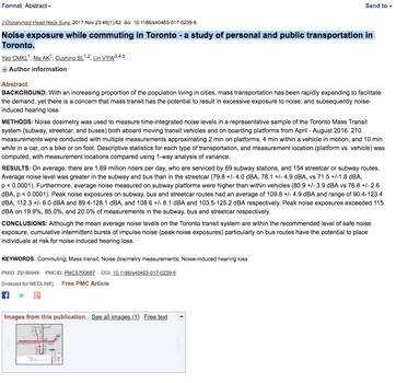 Exposition au bruit lors des déplacements à Toronto. Etude des transports collectifs et individuels. Des dosimétries ont été effectuées sur 210 personnes empruntant le métro, le tramway, le bus, leur voiture personnelle, un vélo, ou se déplaçant à pied. Les bus et les métros sont les plus bruyants notamment dans les stations avec des niveaux de crête pouvant atteindre 114 dB. 9% des expositions au bruit du métro et 12% des expositions au bruit des bus dépassent les recommandations de l'Environmental Protection Agency (EPA) -