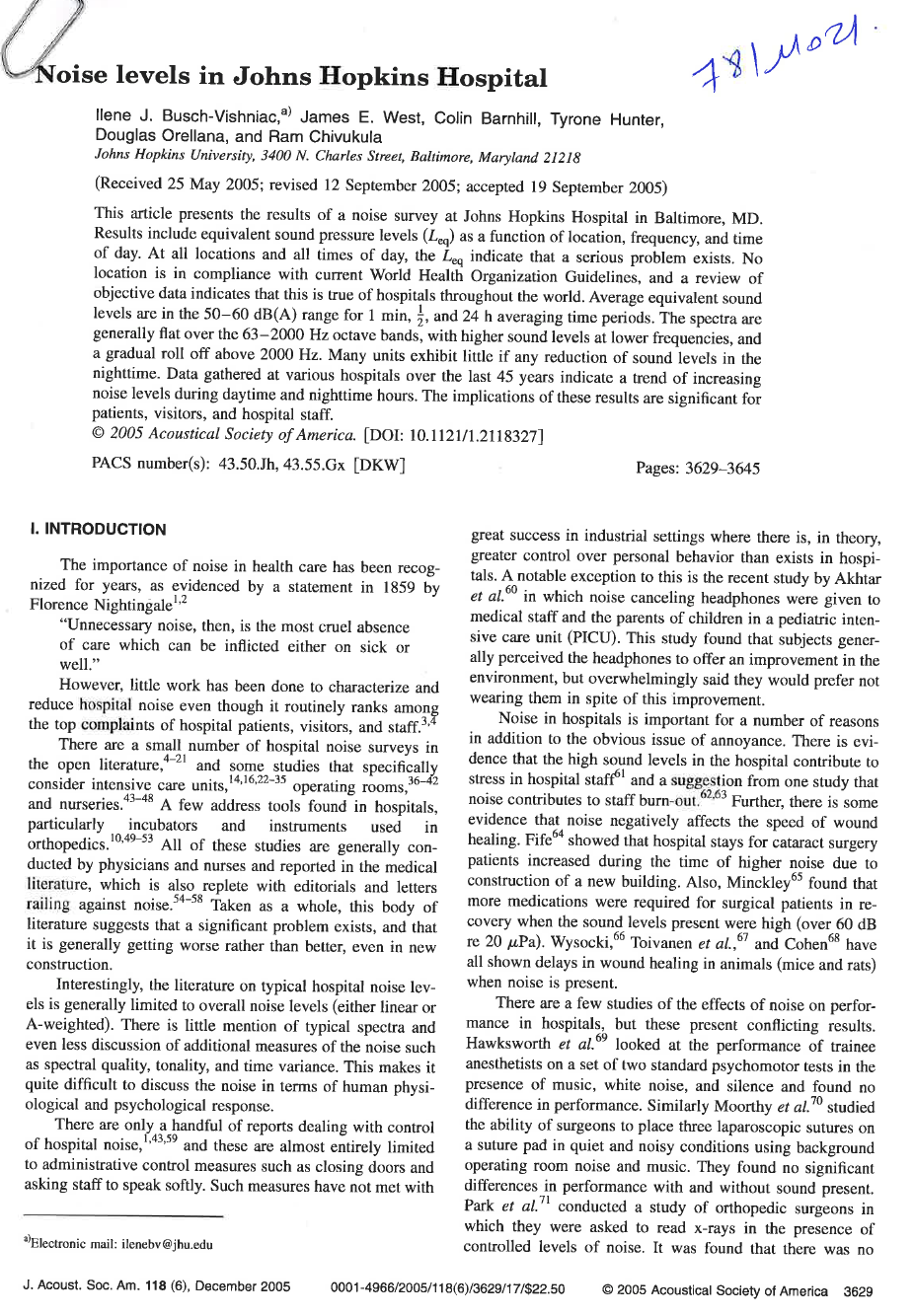 Les niveaux sonores à l’hôpital Johns Hopkins. Revue de la littérature de ces quarante cinq dernières années sur les niveaux sonores à l’intérieur des hôpitaux. Les auteurs décrivent une augmentation des niveaux sonores dans le temps selon les différentes heures de la journée. Dans un second temps, ils s’intéressent plus particulièrement à l’hôpital Johns Hopkins de Baltimore où ils mesurent les niveaux sonores dans plusieurs services. Il n’y a pas de lieux respectant les valeurs guides de l’OMS et il semble que ce serait le cas dans beaucoup d’hôpitaux à travers le monde. En outre, les niveaux sonores mesurés sont importants pouvant interférer avec le sommeil, les performances ou l’intelligibilité de la parole. L’accroissement des sources de bruit semble être sous-estimé dans les hôpitaux. -