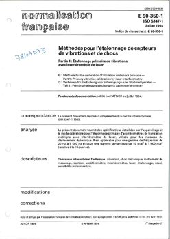 Norme E 90-350-1. Méthodes pour l'étalonnage de capteurs de vibrations et de chocs, Partie 1: Etalonnage primaire de vibrations avec interféromètre de laser