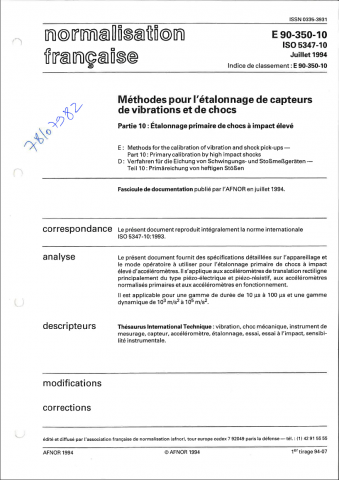 Norme E 90-350-10. Méthodes pour l'étalonnage de capteurs de vibrations et de chocs, Partie 10 : Etalonnage primaire de chocs à impact élevé