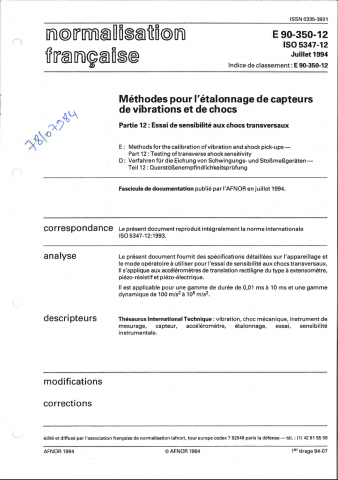 Norme E 90-350-12. Méthodes pour l'étalonnage de capteur de vibrations et de chocs, Partie 12 : Essai de sensibilité aux chocs transversaux.