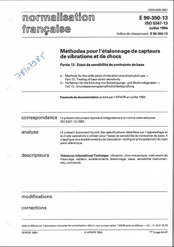 Norme E 90-350-13. Méthodes pour l'étalonnage de capteurs de vibrations et de chocs, Partie 13: Essai de sensibilité de contrainte de base