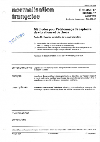 Norme E 90-350-17. Méthodes pour l'étalonnage de capteurs de vibrations et de chocs, Partie 17 : Essai de sensibilité de température fixe