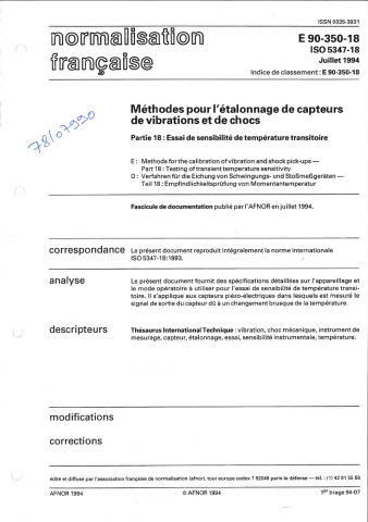 Norme E 90-350-18. Méthodes pour l'étalonnage de capteurs de vibrations et de chocs, Partie 18 : Essai de sensibilité de température transitoire