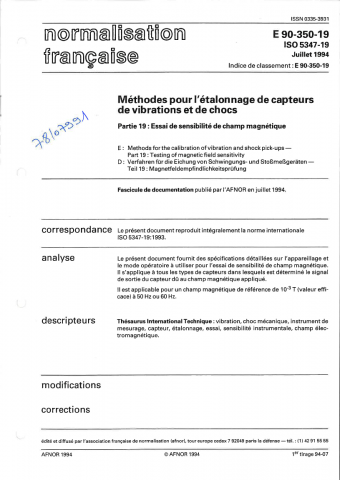 Norme E 90-350-19. Méthodes pour l'étalonnage de capteurs de vibrations et de chocs, Partie 19 : Essai de sensibilité de champ magnétique.