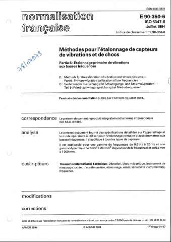 Norme E 90-350-6. Méthodes pour l'étalonnage de capteurs de vibrations et de chocs, Partie 6 : Etalonnage primaire de vibrations aux basses fréquences