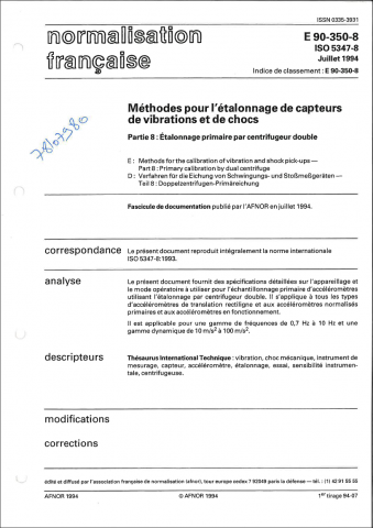 Norme E 90 -350-8. Méthodes pour l'étalonnage de capteurs de vibrations et de chocs, Partie 8 : Etalonnage primaire par centrifugeur double