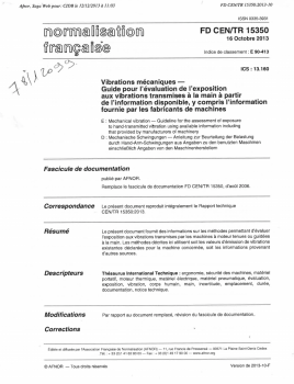 Norme FD CEN/TR 15350. Vibrations mécaniques. Guide pour l'évaluation de l'exposition aux vibrations transmises à la main à partir de l'information disponible, y compris l'information fournie par les fabricants de machines.