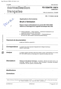 Norme FD CEN/TR 15874. Applications ferroviaires. Bruit à l'émission. Essai en ligne conformément à la norme EN 15610 : 2009 (78/11401) relative au mesurage de la rugosité acoustique des rails