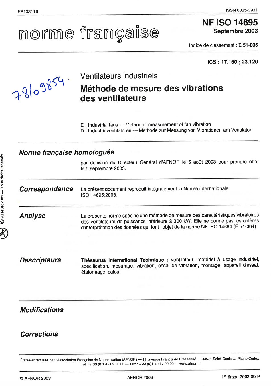 Norme ISO 14695. Ventilateurs industriels - méthode de mesure des vibrations des ventilateurs
