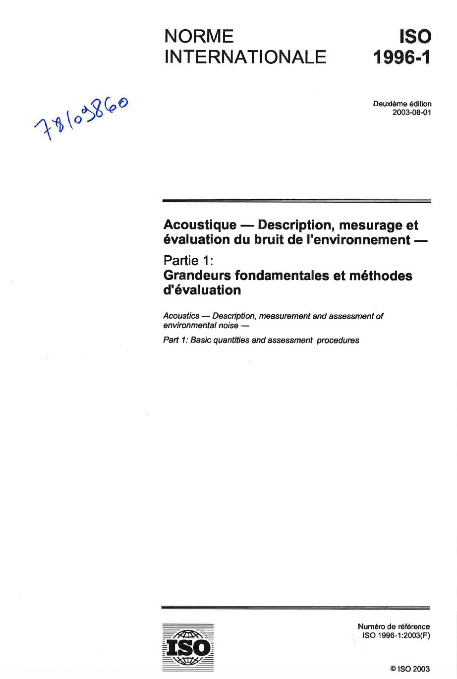 Norme ISO 1996-1. Acoustique - Description, mesurage et évaluation du bruit de l'environnement. Partie 1 : Grandeurs fondamentales et méthodes d'évaluation