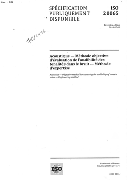 Norme ISO 20065. Acoustique. Méthode objective d'évaluation de l'audibilité des tonalités dans le bruit. Méthode d'expertise.